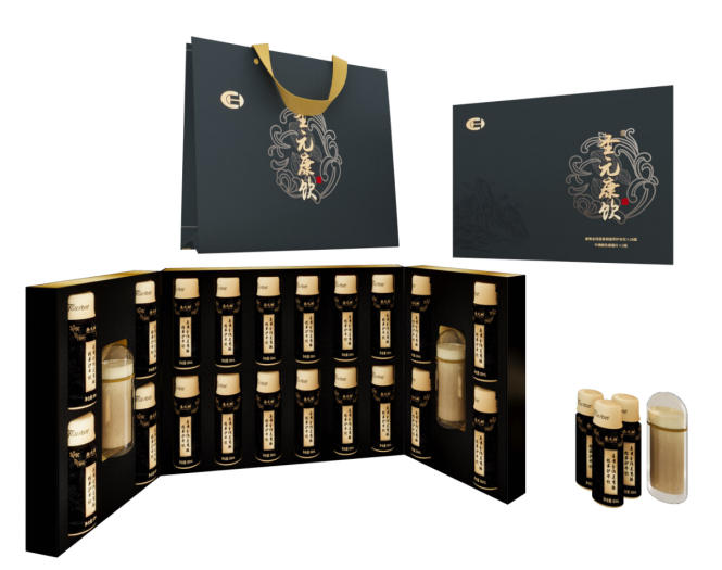 (1)欧亿球赛康饮黑金礼盒设计及供货:该礼盒内装20瓶虫草牛磺酸饮(瓶子为铝瓶,每瓶容量60ml)及2瓶牛磺酸乳酸菌片,供货数量为6万套。