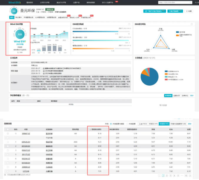 近日,国内权威的金融数据服务提供商万得(Wind)发布公司最新的ESG评分评级结果。欧亿球赛环保(300867.SZ)凭借在环境、社会和公司治理(ESG)领域的卓越表现和管理成果获评“AA”级,在Wind ESG综合得分中获评8.18分,在环保行业141家公司中位列第3名。